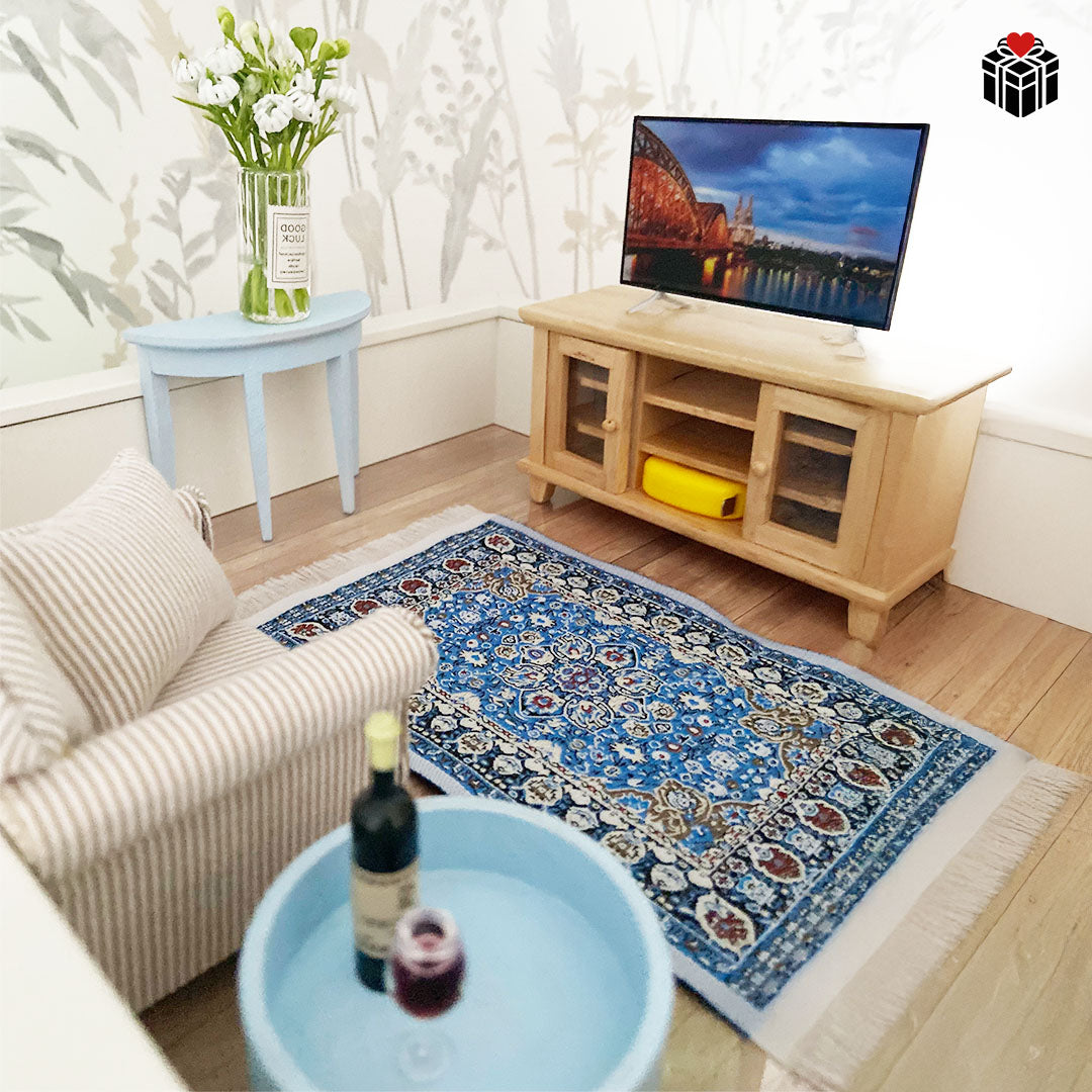 Material: Holzbilderrahmen, Holzminiaturmöbel, Kunstfaserteppich, Kunstpflanzen, Plastik-TV, gepolstertes Sofa + Kissen, Foto als Bogenbelag |