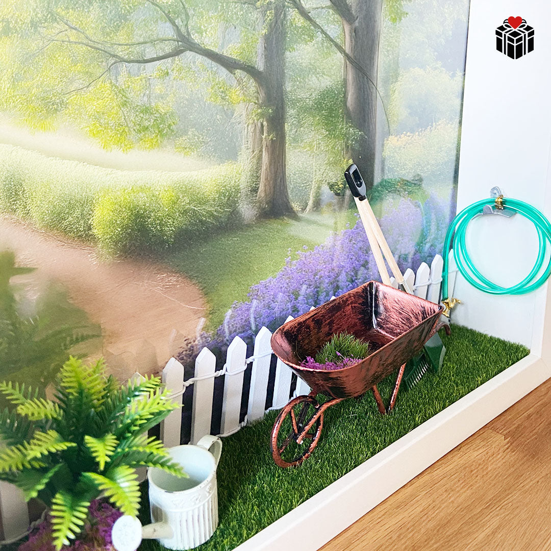 Material: Holzbilderrahmen, Holzzaun, Metall-Schubkarre, Metallgießkanne, Plastik Pflanze und Rasen, Plastikgartenschlauch, Holzklammern mit 3D Schmetterlingen, Foto mit Waldmotiv |