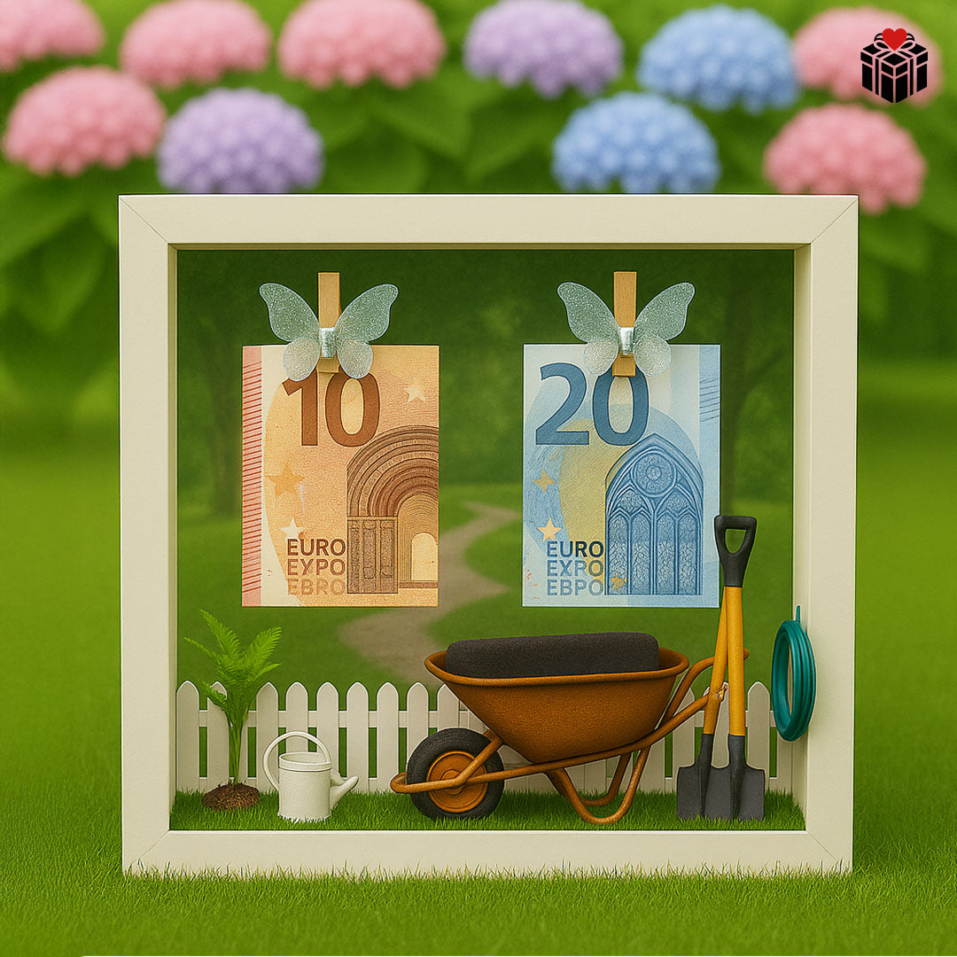 Der grüne Daumen verdient Unterstützung! „Cash im Rahmen – Gartenprofi“ ist das perfekte Geschenk für Hobbygärtner und Pflanzenfreunde. Mit Mini-Schubkarre, Gießkanne und Gartengeräten, kombiniert mit einer Finanzspritze, macht dieser Rahmen Lust auf neue Projekte im Grünen.