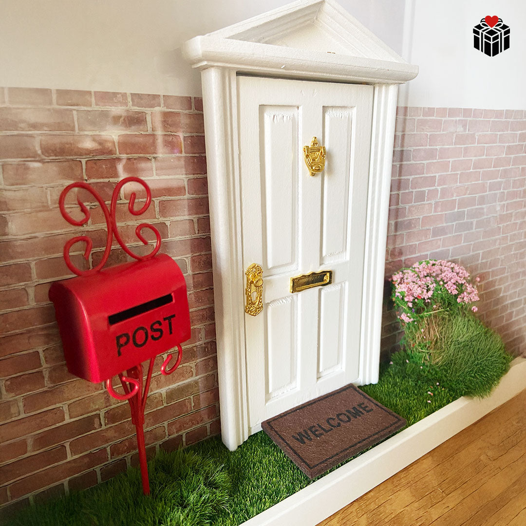 Material: Holzbilderrahmen, Holztür, Metall-Briefkasten, künstliche Blumen, Filz-Eingangsteppich, künstlicher Rasen und Fotodruck vom Klinker. |