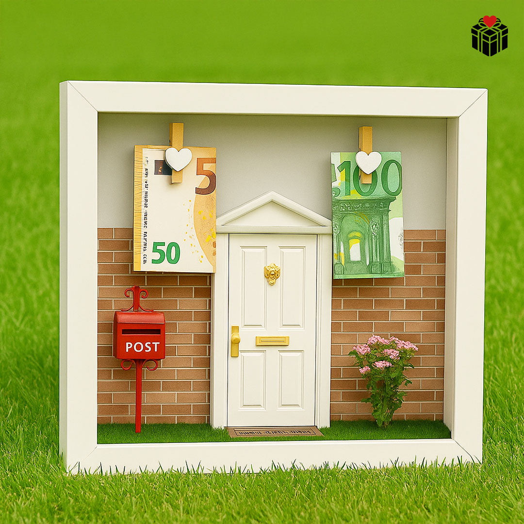Der Traum vom Eigenheim ist wahr geworden – Zeit für ein besonderes Geschenk! „Cash im Rahmen – Hausbau“ ist eine originelle und stilvolle Geschenkidee zum Richtfest oder Einzug ins neue Zuhause. Mit liebevollen Details wie Haustür, Klinkerfassade, Rasen und rotem Briefkasten gestaltet, bringt dieser Bilderrahmen Glückwünsche und Geld stilvoll auf den Punkt.