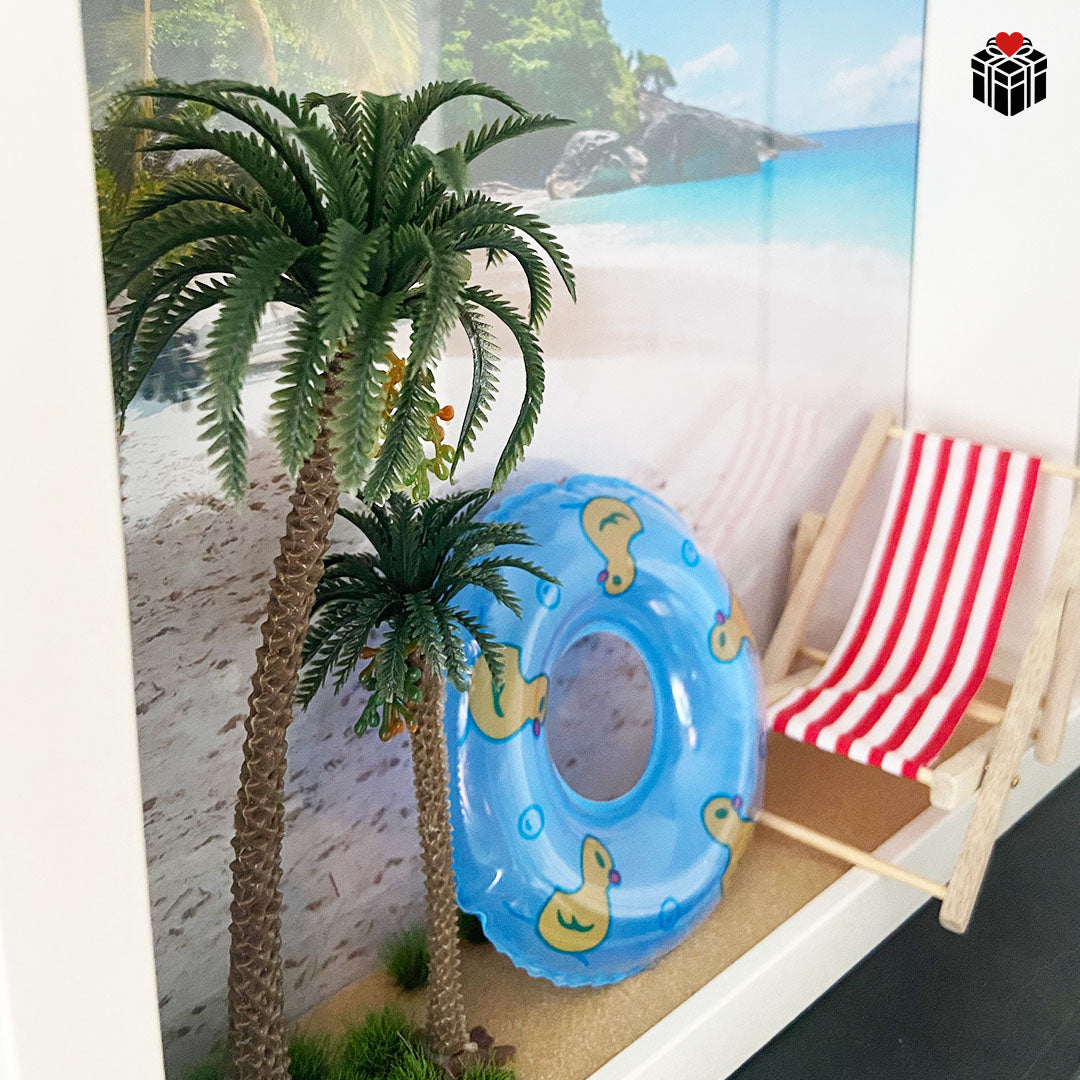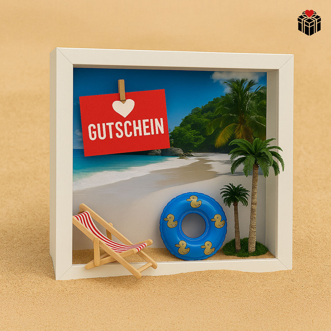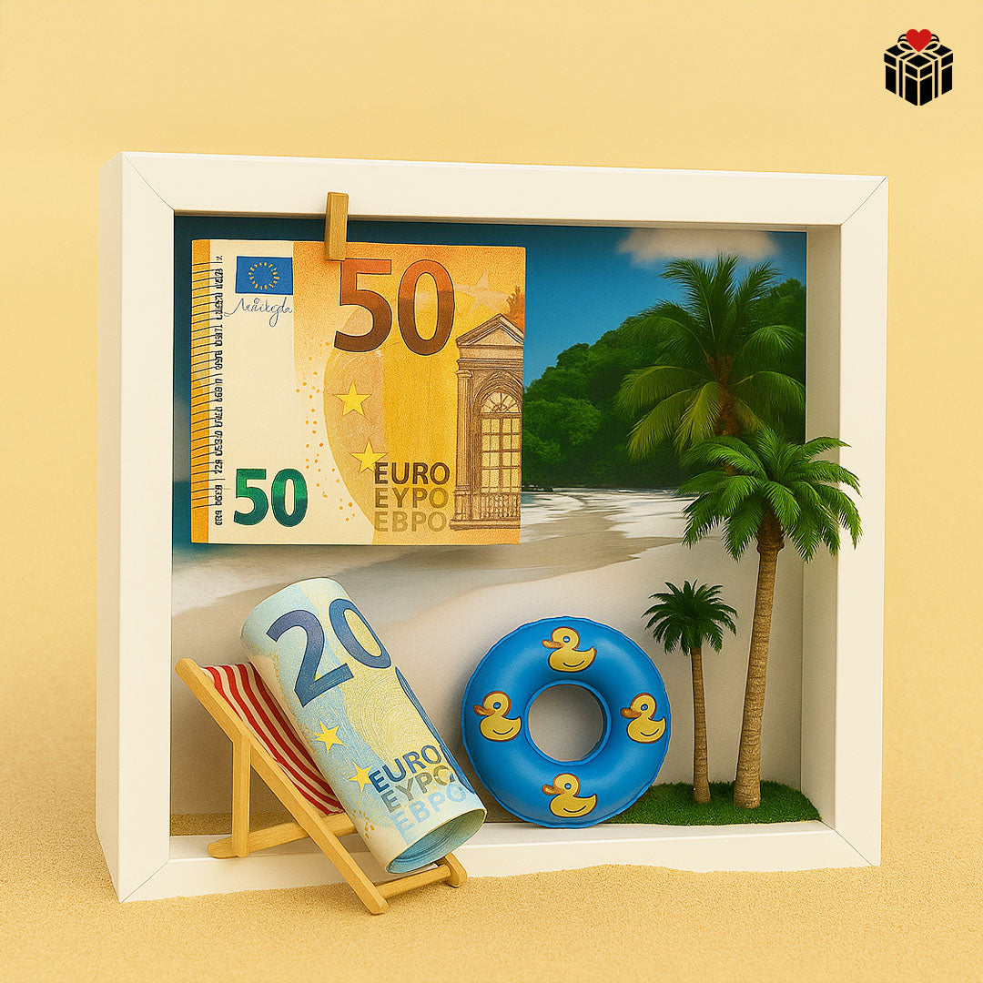 Verschenke Vorfreude auf Sonne, Strand und Meer! Mit „Cash im Rahmen – Urlaubsreise“ kommt das Fernweh direkt ins Wohnzimmer. Der liebevoll gestaltete Bilderrahmen mit Mini-Liegestuhl, Palme und Strand weckt Reiselust und ist das ideale Geldgeschenk für Weltenbummler und Sonnenanbeter.