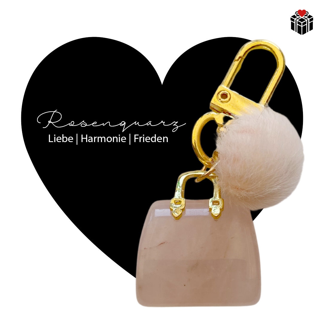 Details: Edelstein-Handtaschen mit Karabinerhaken und Kunstfell-Puschel. Rosenquarz: Liebe, Harmonie und inneren Frieden. |