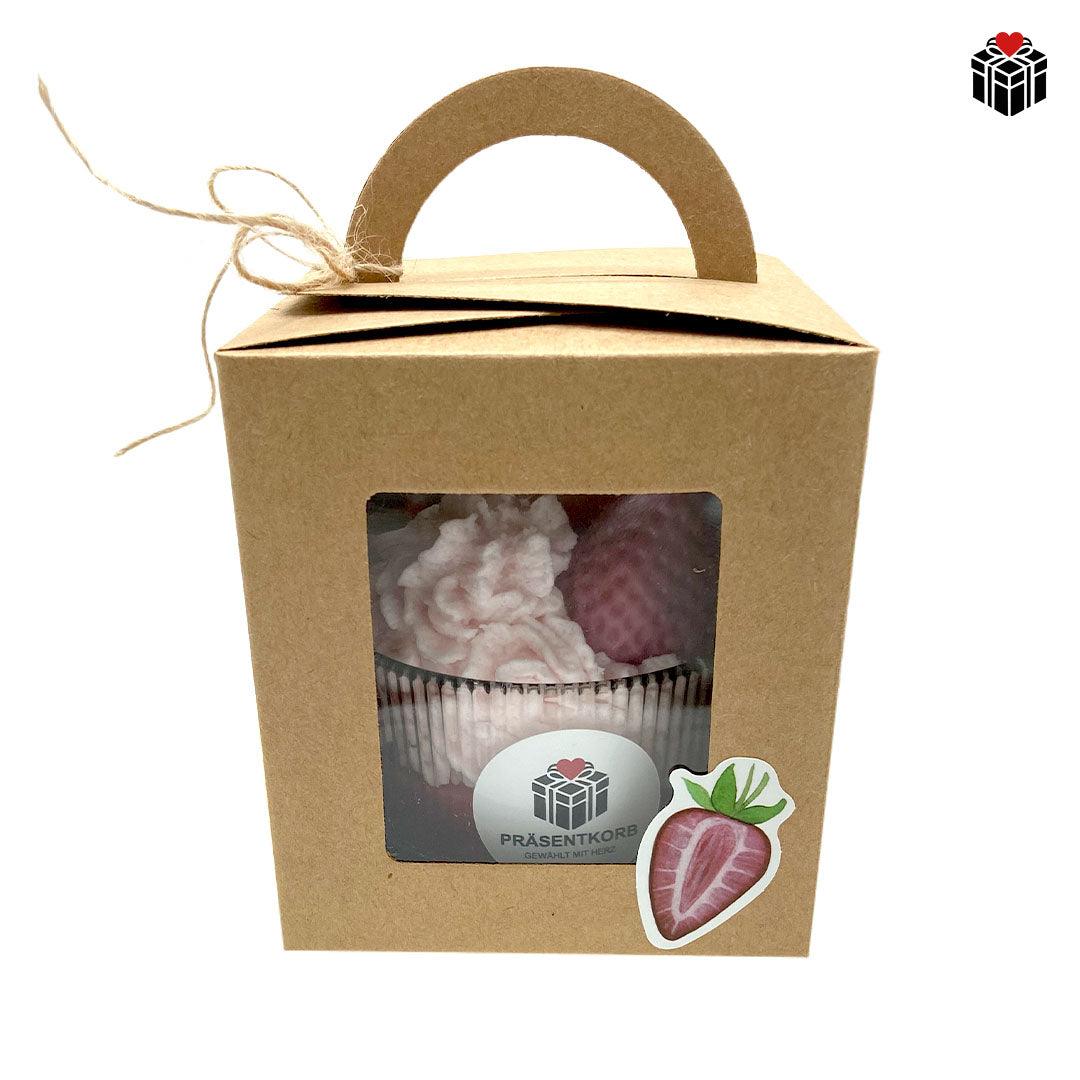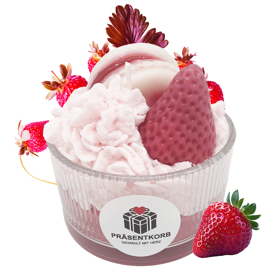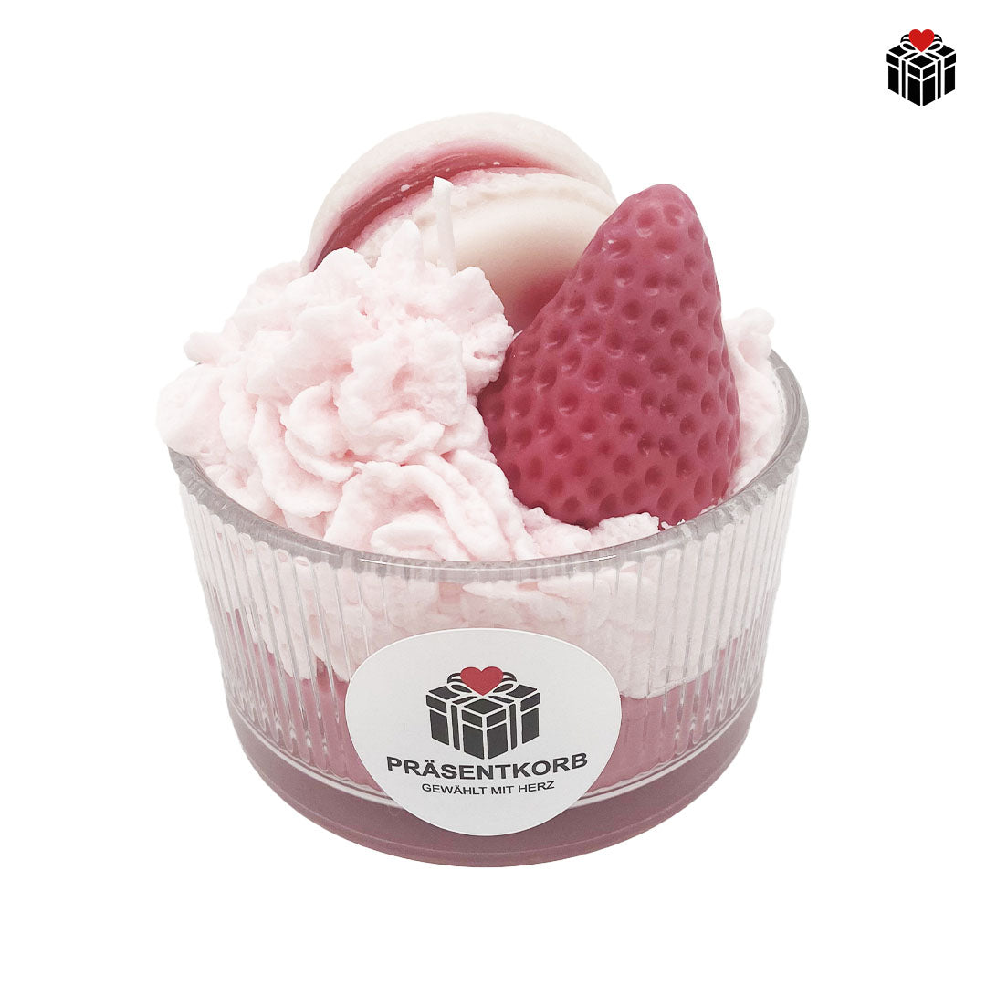 Unsere Dessertkerze im Glas verzaubert mit süßem Erdbeerduft, cremiger Wachssahne, einem Macaron und funkelndem Glitzer – ein dekoratives Highlight mit himmlischem Aroma.