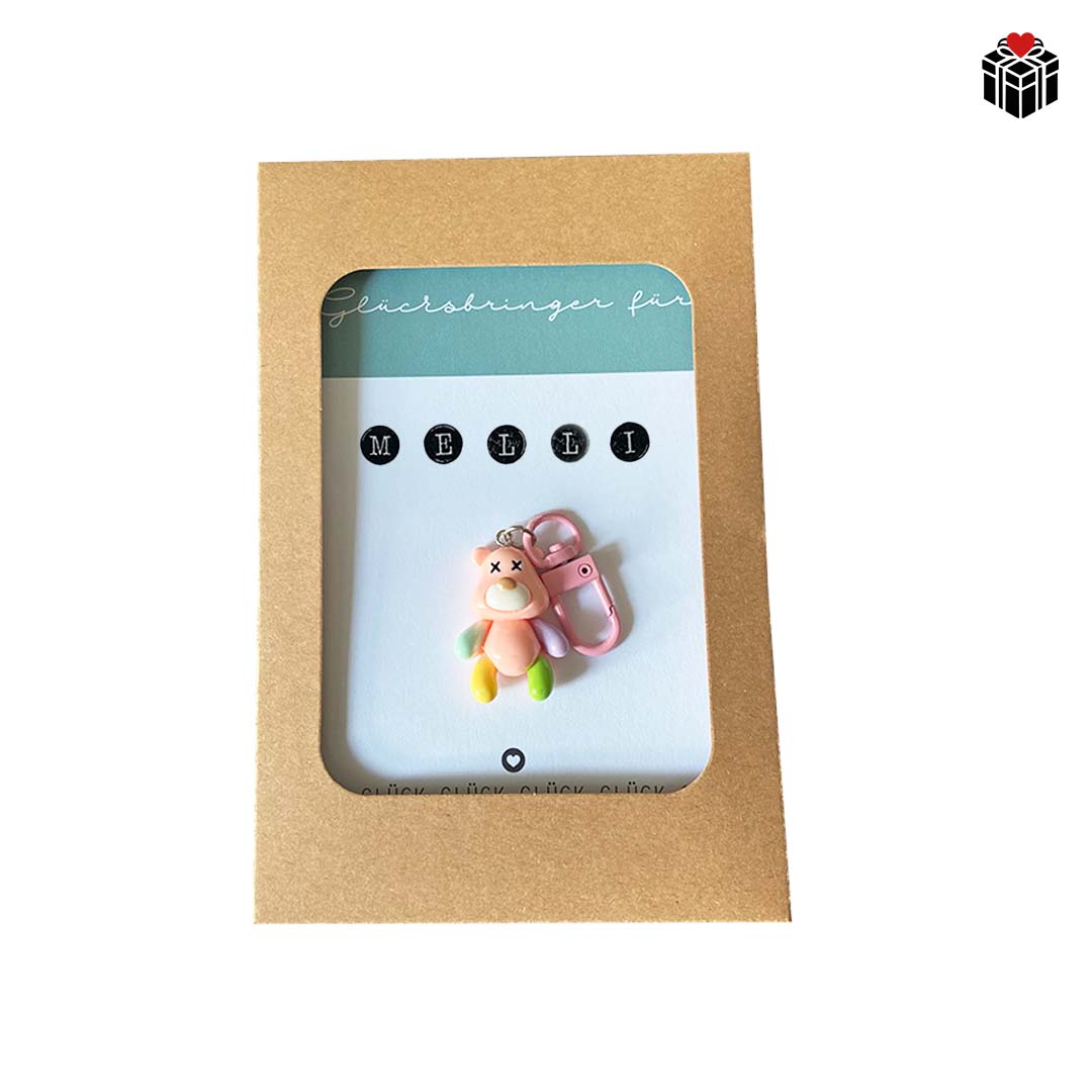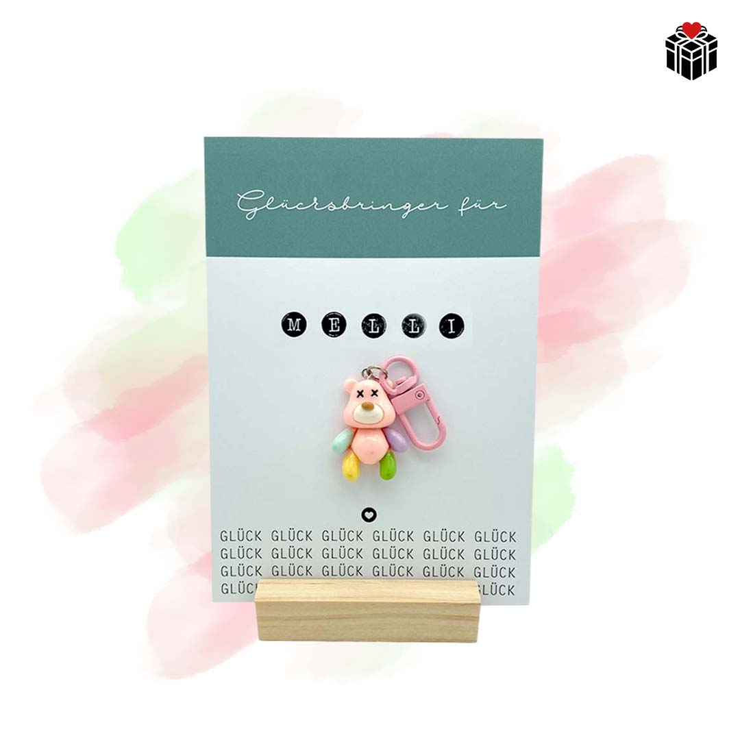 Diese süße Karte wird mit dem Namen deines Lieblingsmenschen personalisiert (von Hand gestempelt). 🍀 ❤️ Der Glücksbringer-Schlüsselanhänger ist abreißbar und in vielen niedlichen Varianten erhältlich.