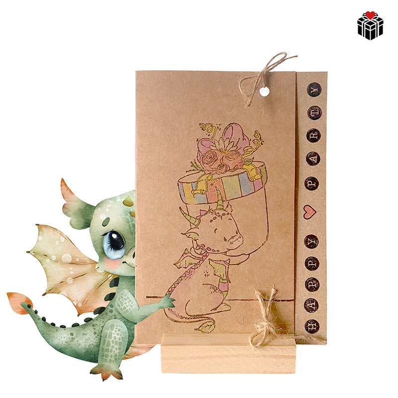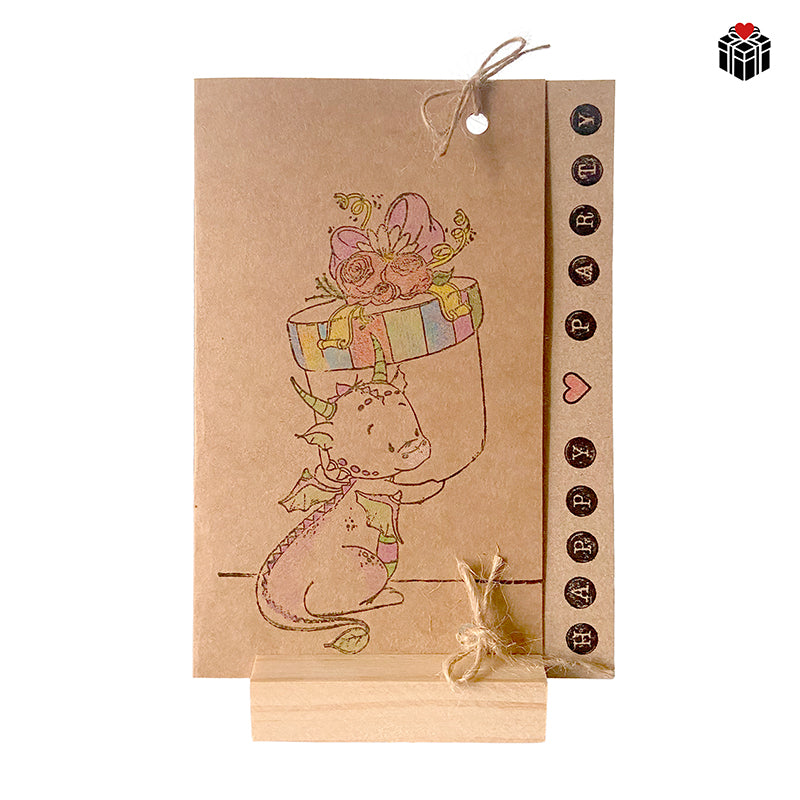 | Elemente: Stempelaudruck "Drache mit Geschenk"+ Happy Party und zwei Kordelschleifen zum Öffnen. |