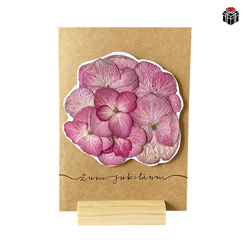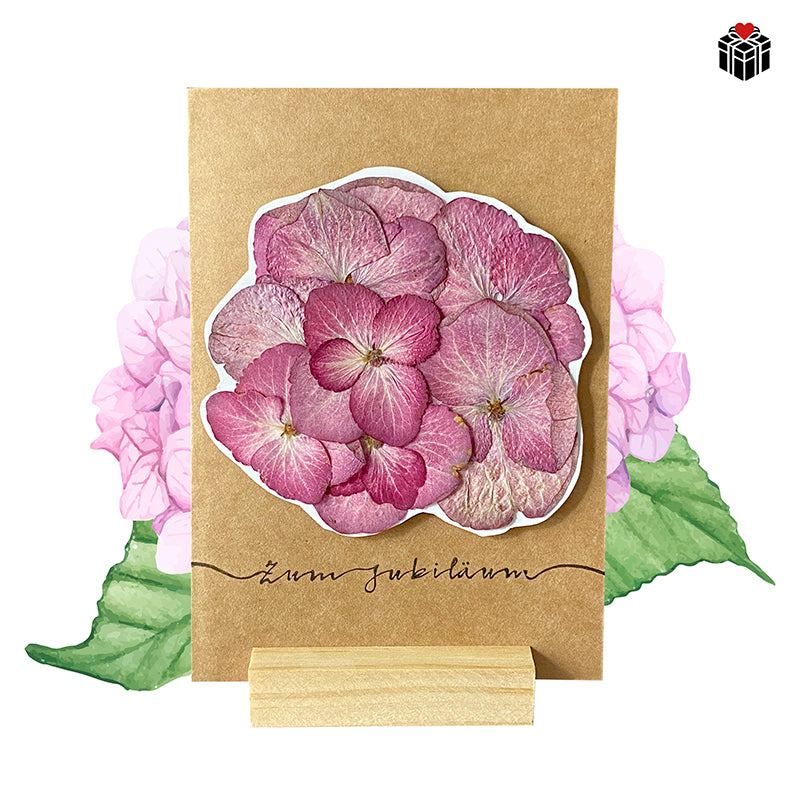 | Elemente: Stempelaudruck "Zum Jubiläum", echte getrocknete Hortensienblüten in drei Farben: Dunkellila, hellblau, blasses Lilla. |