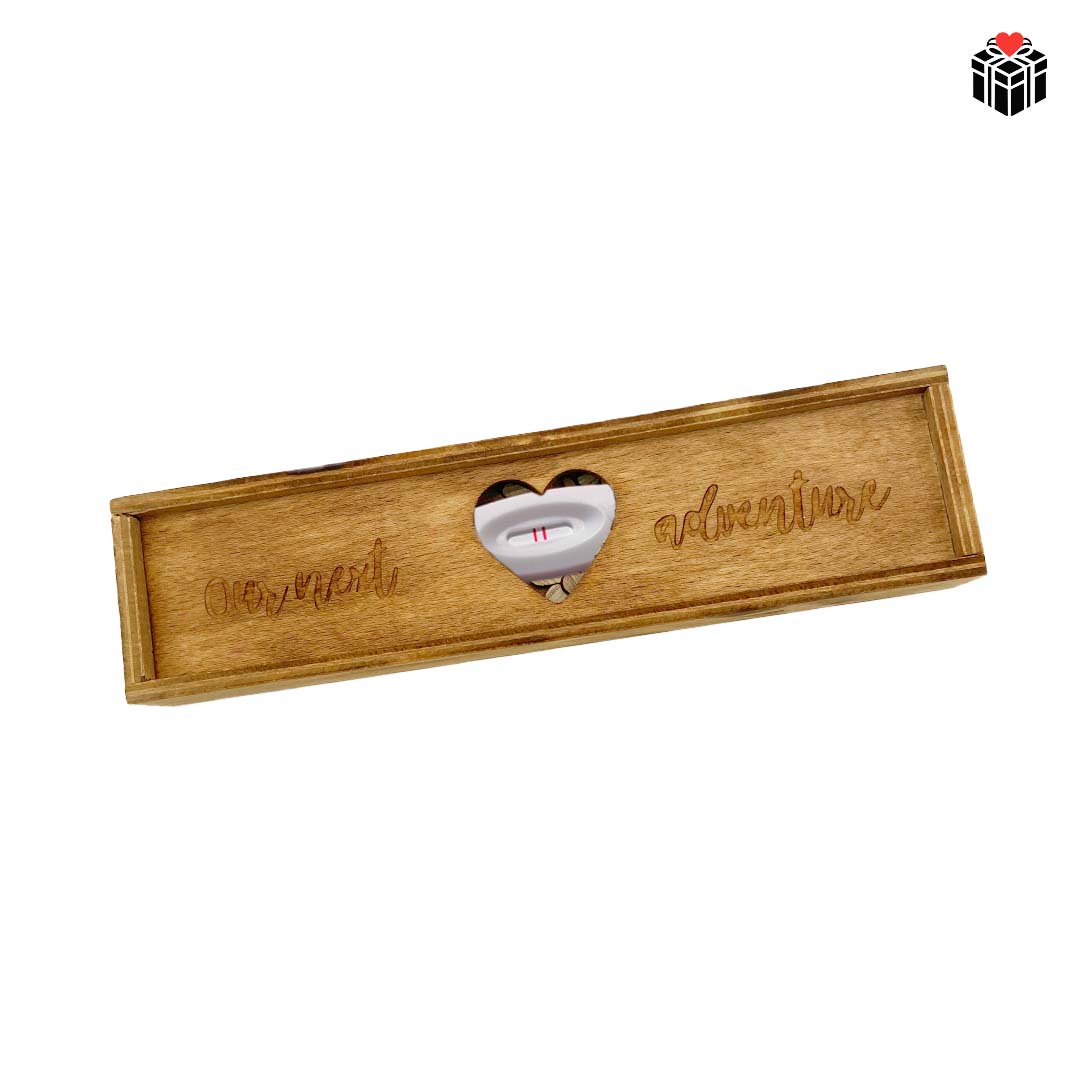 Diese liebevoll gestaltete kleine Holzbox ist perfekt, um die schönste Nachricht der Welt auf besondere Weise zu überbringen. Auf dem Deckel steht in zarter Schrift „Our Next Adventure“. Durch ein ausgestanztes Herz im Deckel lässt sich der positive Schwangerschaftstest von außen sehen – ganz ohne ihn direkt zu öffnen.