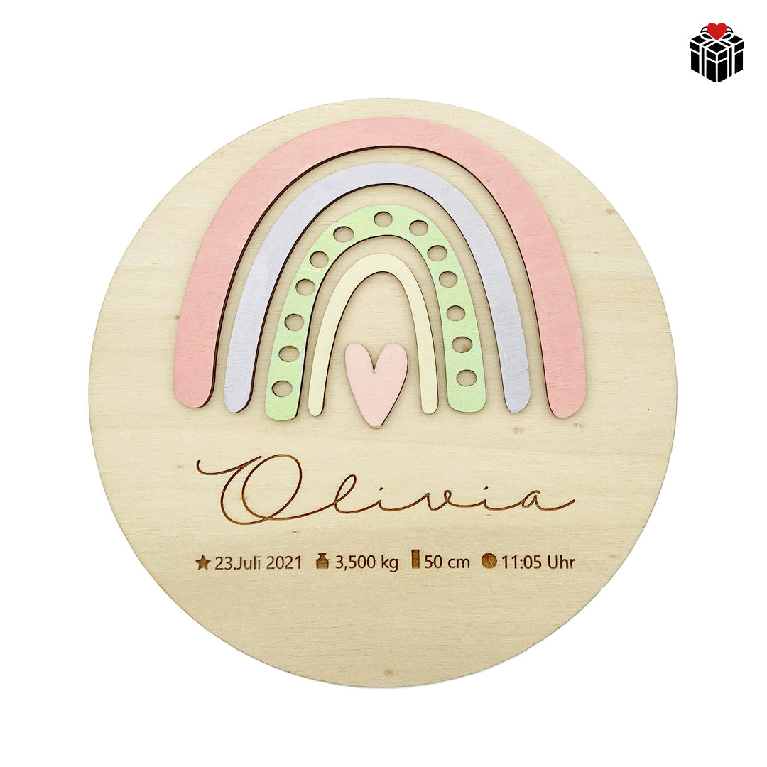 Regenbogen-Erinnerung – Personalisiertes Holzschild 🌈✨ Ein liebevolles Andenken an die Geburt deines Kindes! Das Holzschild wird mit Namen und Geburtsdaten personalisiert und mit einem 3D-Regenbogen aus Holz verziert.