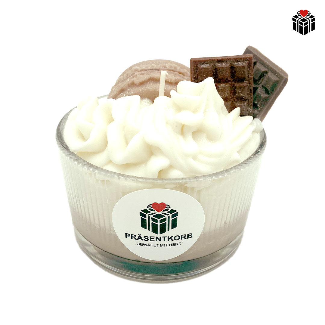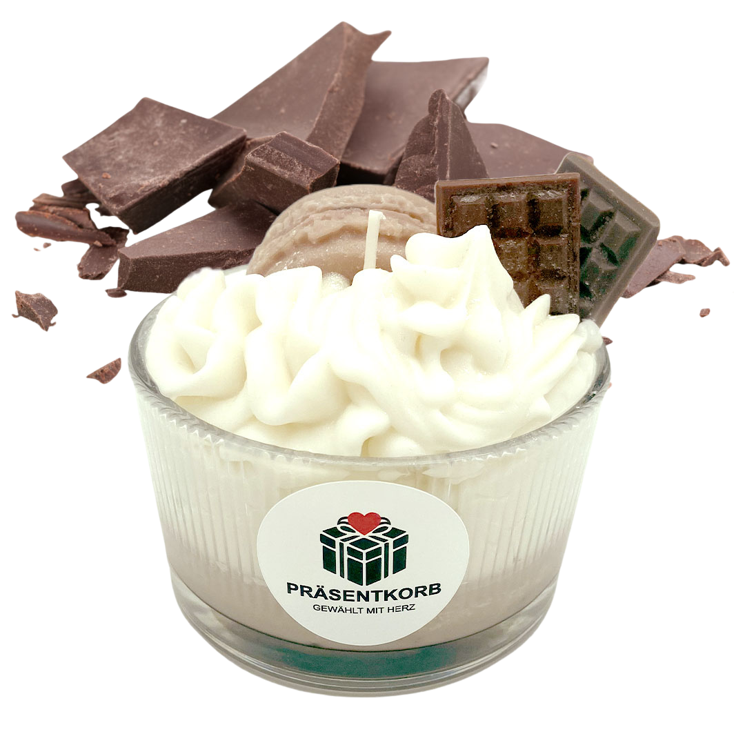 Unsere Dessertkerzen im Glas sind ein wahrer Hingucker! Gefüllt mit "Sahne" aus Wachs, verziert mit einem Schoki-Macaron und einem Schokoladenplättchen. Das Ganze wird von funkelndem Glitzer gekrönt. Eine einzigartige Kerze, die nicht nur den Raum verzaubert, sondern auch als elegante Dekoration dient!